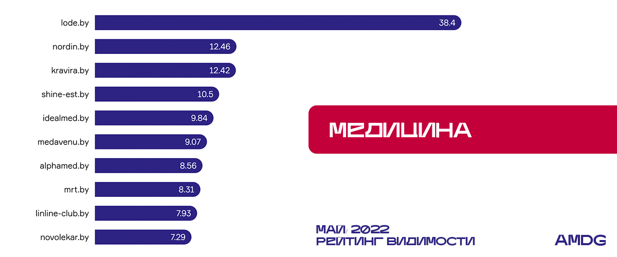 Падение показателя видимости у medavenu.by на 8,1% привело к смене места в рейтинге со второго на шестое. У kravira.by в этом году “американские горки” с показателем видимости. В начале года сайт входил в ТОП-3, затем было падение на седьмую строчку. И вот в мае ресурсу снова удалось занять третью позицию с показателем 12,42%.