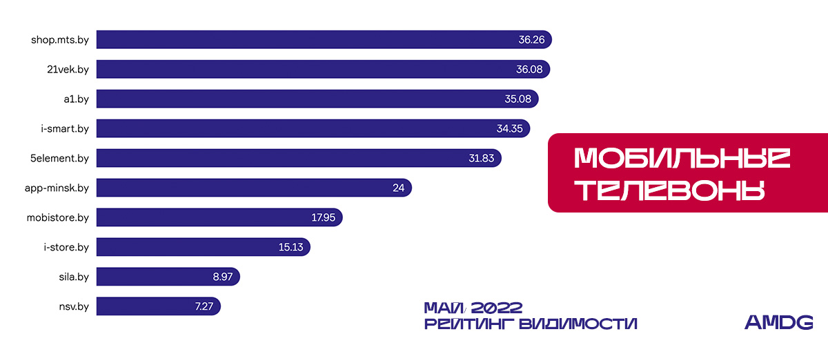 Новый лидер в категории “Мобильные телефоны” — интернет-магазин shop.mts.by с показателем 36,06%. Напомним, что 5element.by был лидером на протяжении 5 месяцев, но теперь потерял в видимости 6,73% и опустился с первого на пятое место. I-smart.by вошел в ТОП-5 с максимальным ростом в категории (14,85%).