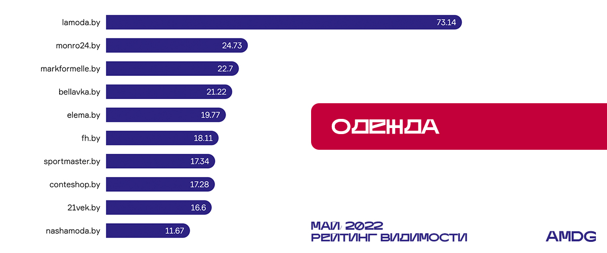 С начала года monro24.by демонстрирует рост в категории “Одежда”. В мае сайт достиг 2-й позиции в рейтинге с показателем видимости 24,73%. Лидер остался неизменным — это интернет-магазин lamoda.by с ростом на 4,03%. Значительное повышение процента видимости (+4,21%) отмечено у fh.by. В результате сайт переместился с 10-й на 6-ю позицию.