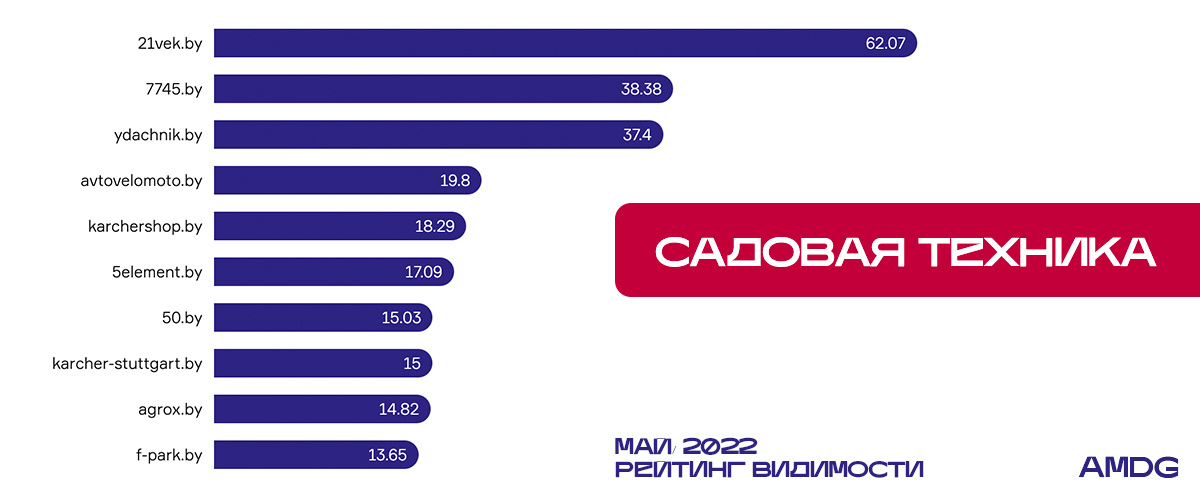 Начало дачного сезона повлияло на поисковую выдачу. 7745.by переместился на одну строку вверх с ростом +4,3%, а ydachnik.by, напротив, “сделал шаг назад” несмотря на небольшой рост видимости (+0,33%). Серьезное падение произошло у agrox.by (-10%) — теперь сайт занимает девятое место рейтинга.