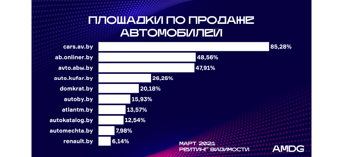 Autoby.by прибавляет 5,28% (+1 строка). Снижение видимости Forsage.by на 4% приводит к его выпадению из десятки (-3 позиции), что позволяет Renault.by попасть в ТОП-10.