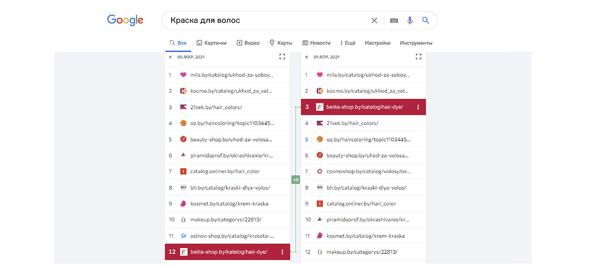 Belita-shop.by впервые оказывается в десятке лидеров (+8,61%) и вытесняет Bh.by на 11-ю строку (+0,41%). Положительная динамика интернет-магазина бренда “Белита” связана с ростом позиций в Google по самым частотным для тематики запросам.