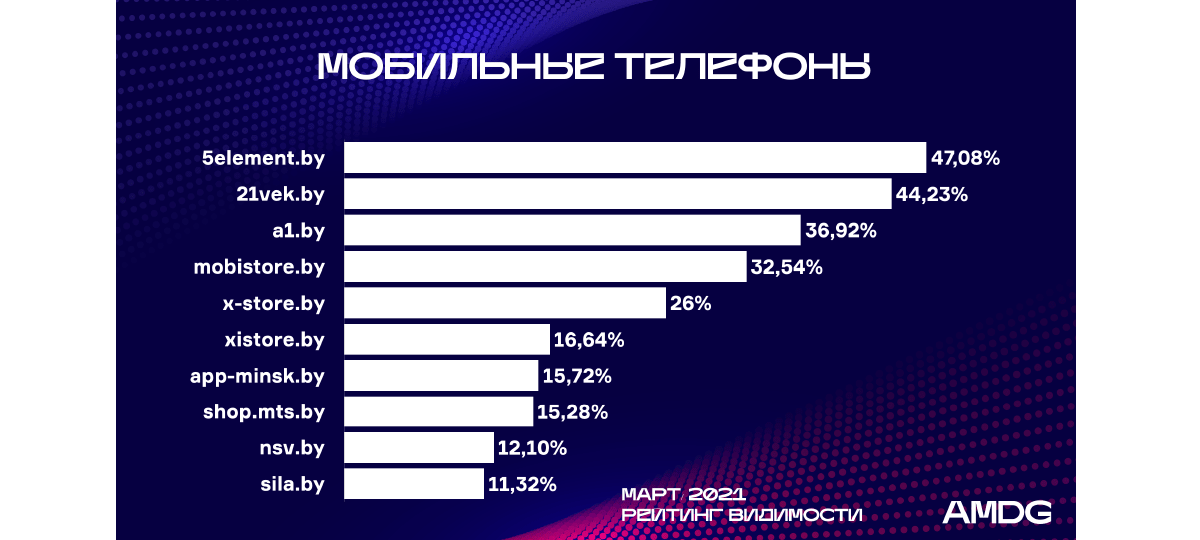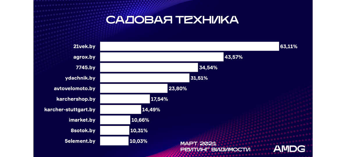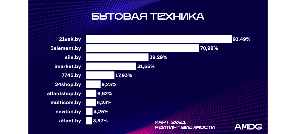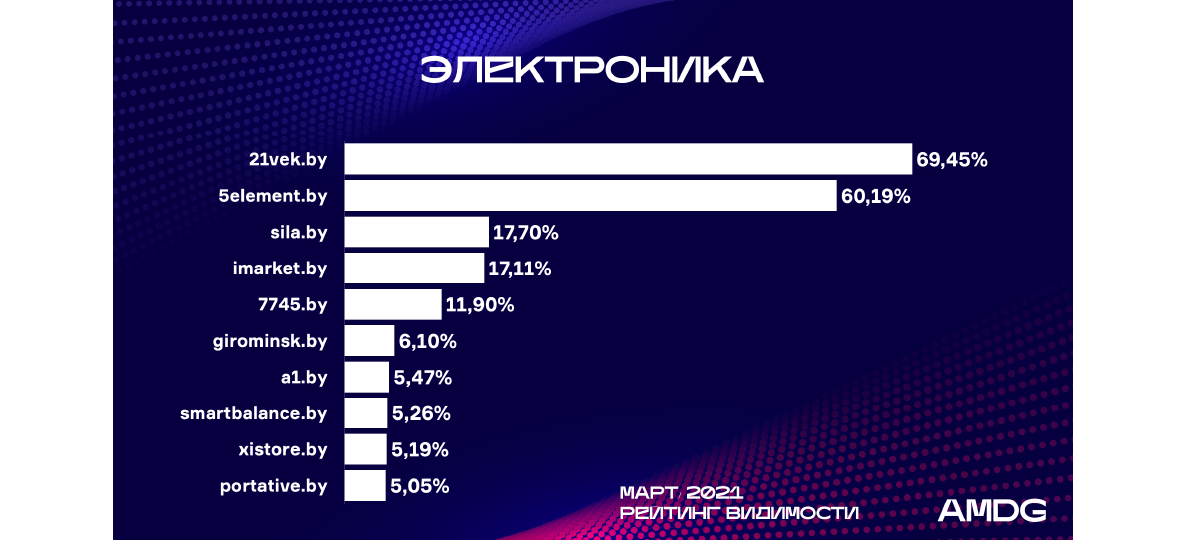 Imarket.by продолжает штурмовать категории: здесь его рост составляет +10,98% и +1 позиция.У 7745.by обратная ситуация: снижение на 8,86% и -1 строка. Multicom.by впервые попадает в ТОП-10, вытеснив Amd.by.