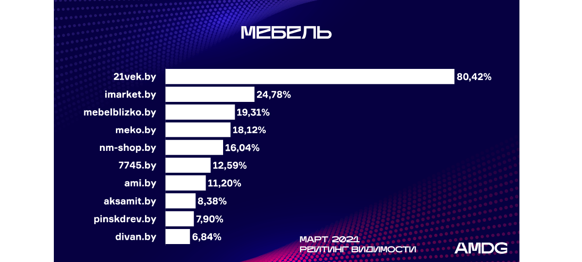 Divan.by после февральского перерыва вновь попадает в десятку (+2 позиции), смещая Mersi.by на 14-ю строку (-6 позиций).