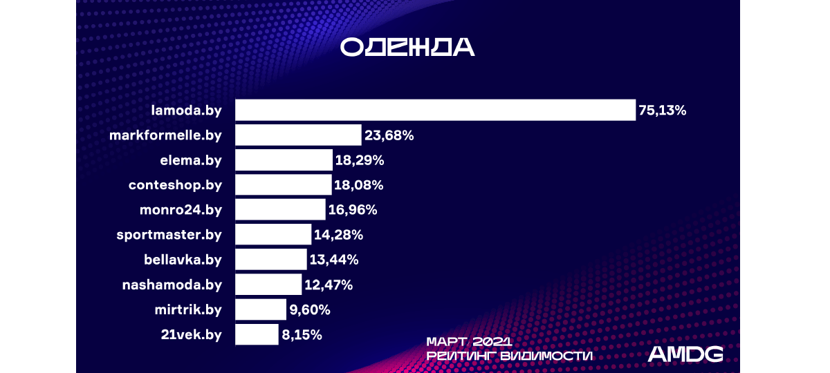 Значительно прибавили в видимости Monro.by (+2 строки) и Bellavka.by (+3 строчки) –в итоге вниз опустились Nashamoda.by, Mirtrik.by и 21vek.by.