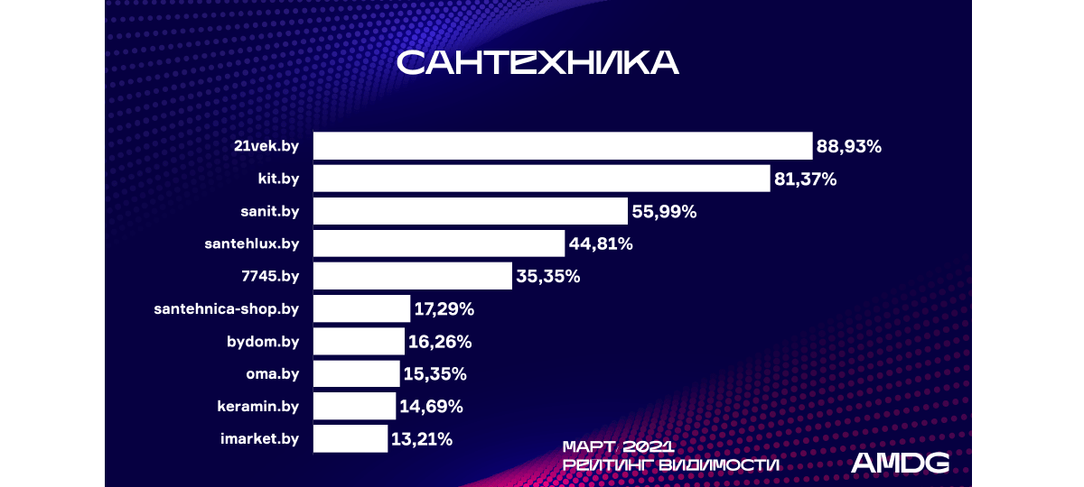 Santehnica-shop.by, новичок прошлого месяца, продолжает двигаться вверх: в результате – +3 строки (+2,01%). Imarket.by вырос на + 9,63% и заменил Mile.by в десятке (-2,19%). А Bydom.by и Oma.by опускаются на строку ниже (-5,67% и -6,28%).