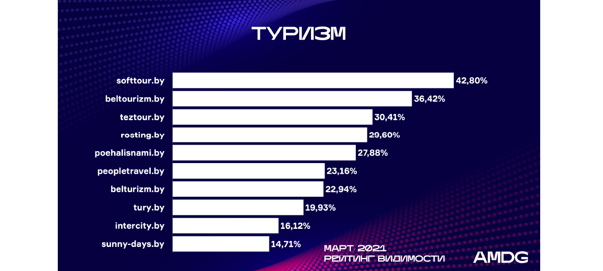 Крупный взлет Beltourizm.by на 13,55% привел его на 2-ю строку и подвинул прежних участников ТОП-3. Poehalisnami.by и Peopletravel.by смещаются на 3 строки ниже каждый, потеряв в среднем 8%. Rosting.by перемещается с 7-й на 4-ю позицию (+9,13%), а Alatantour.by выпадает на 15-ю строку (-4,84%). Его место занимает Intercity.by с ростом на 8,28%.